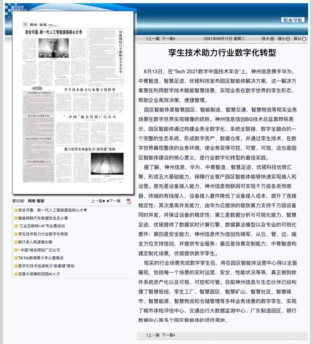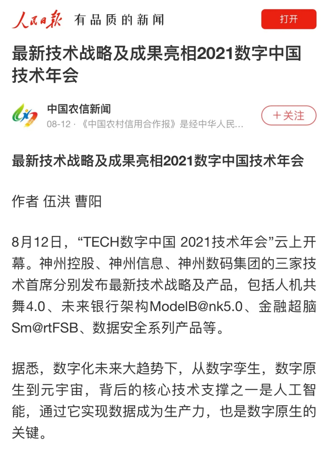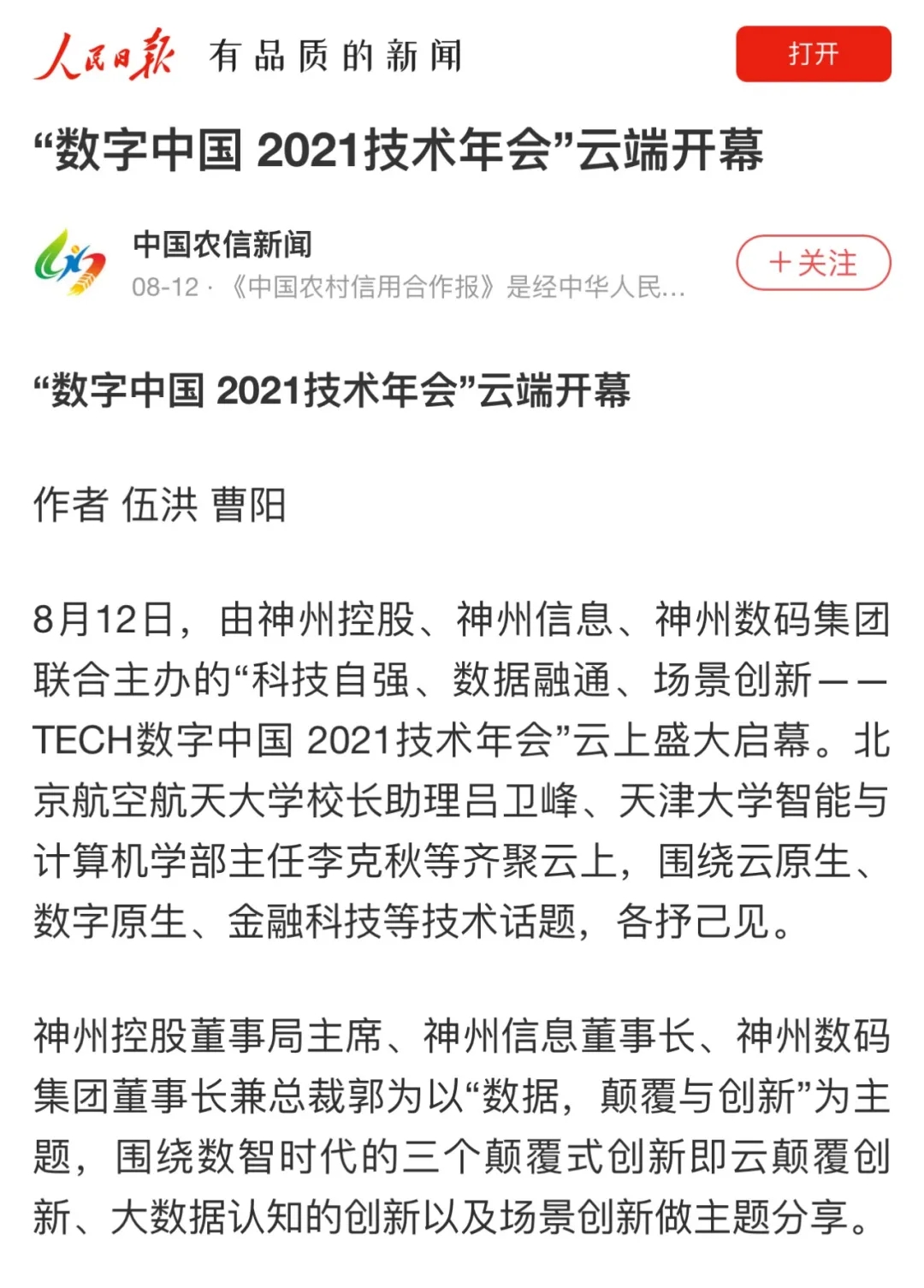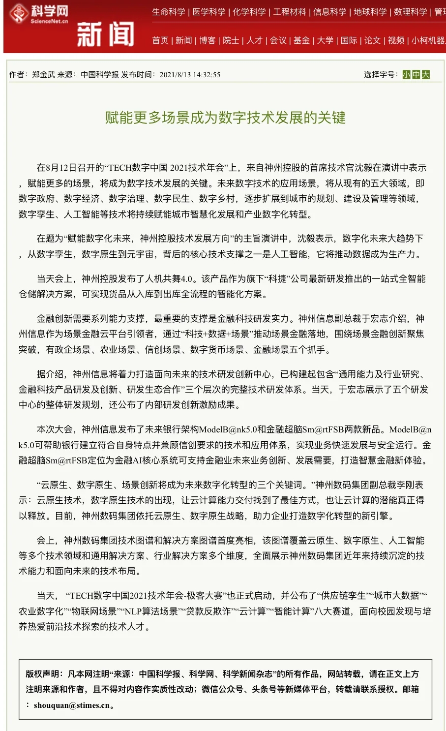 8月12日,由神州控股、神州信息、东升国际集团联合主办的“科技自强、数据融通、场景创新——TECH数字中国 2021技术年会”云上盛大启幕,发布神州信创云、ModelB@nk5.0、金融超脑Sm@rtFSB、云原生数字化安全底座、园区智能体等重磅产品,国内各大权威、影响力媒体多角度多频次对盛况进行报道!
