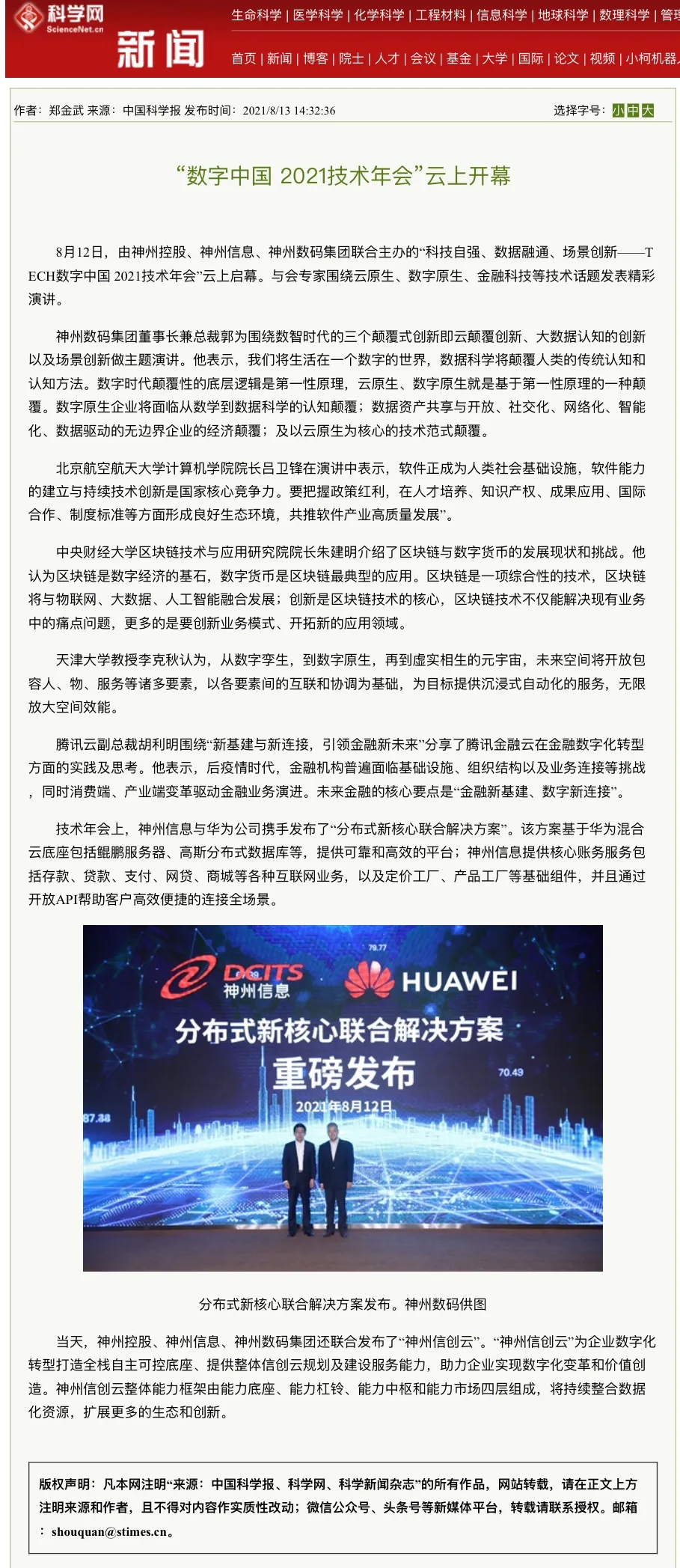 神州信息联合华为发布“分布式新核心联合解决方案”